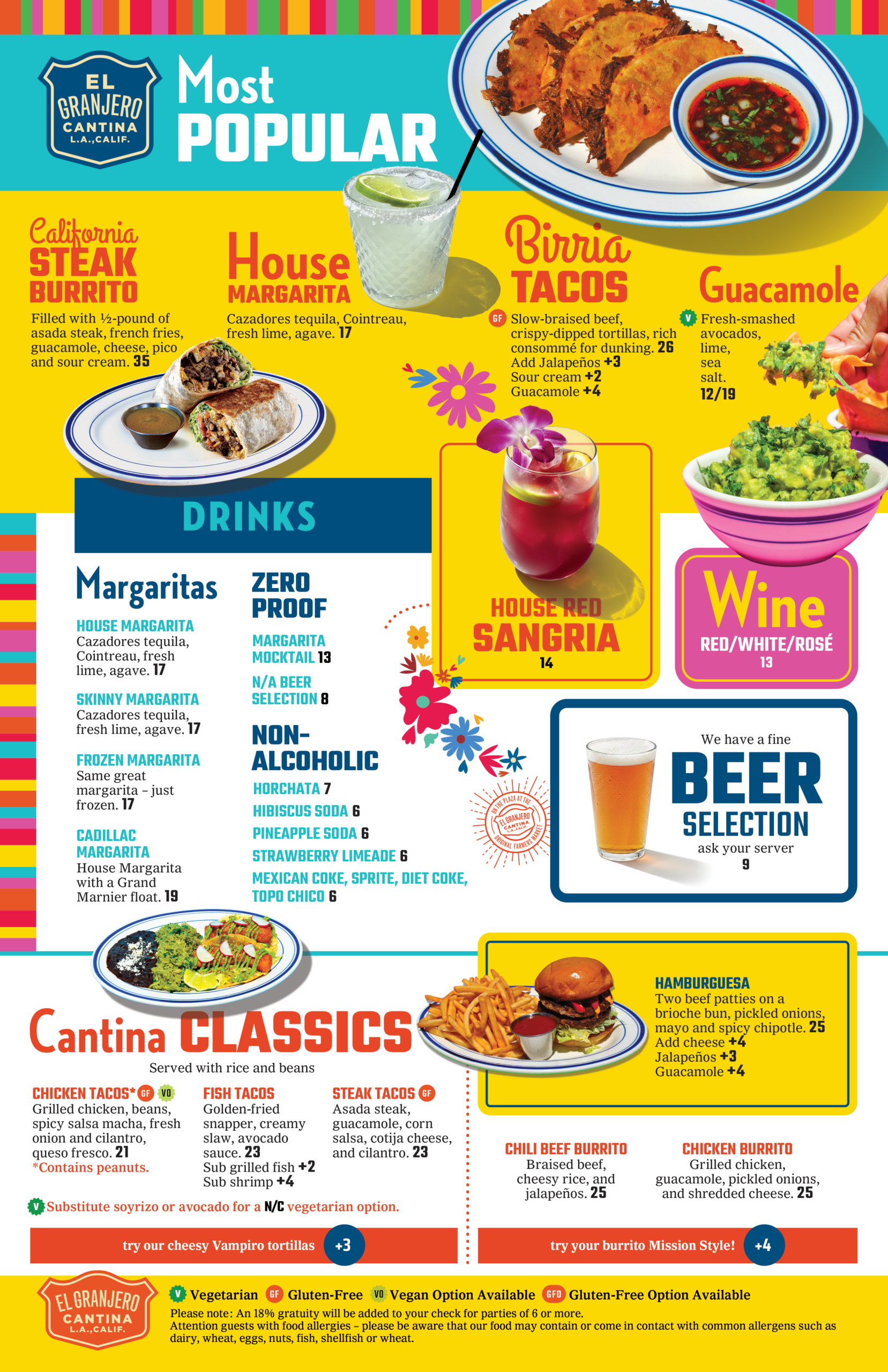 Current logo, 2020 (above), and menu (2026) for El Granjero Cantina