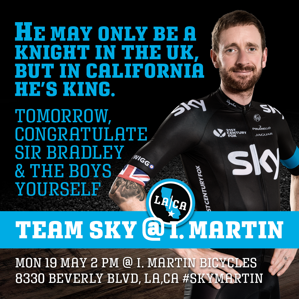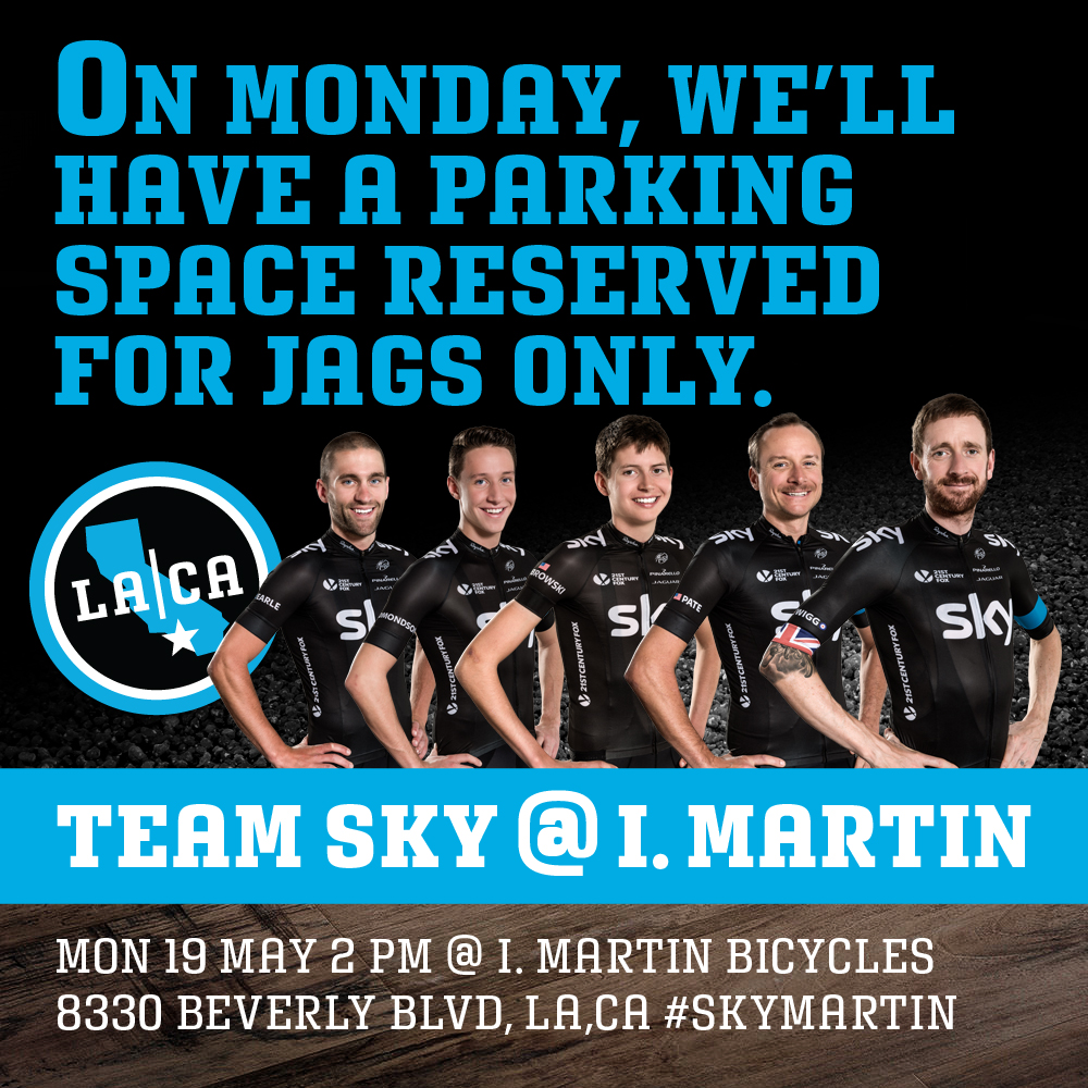 Social media writing and design touting Sir Bradley Wiggins and Team Sky’s victory at the Tour of California (a British team, they had Jaguar support vehicles), plus my Alternate Rebrand and clothing design for LA’s premiere bike shop